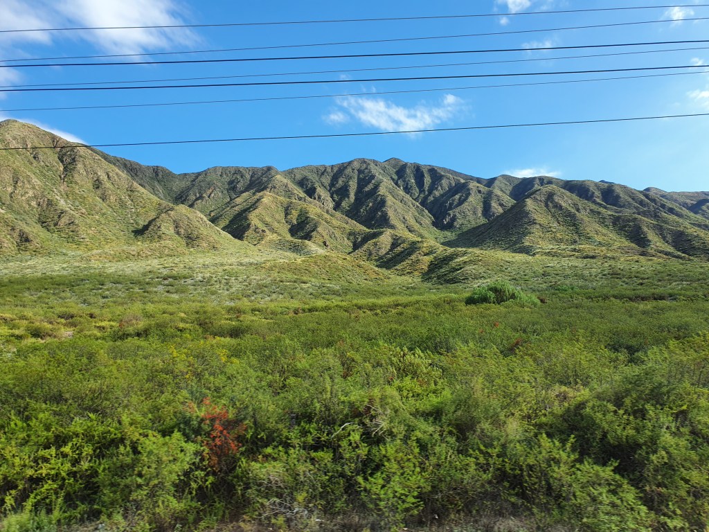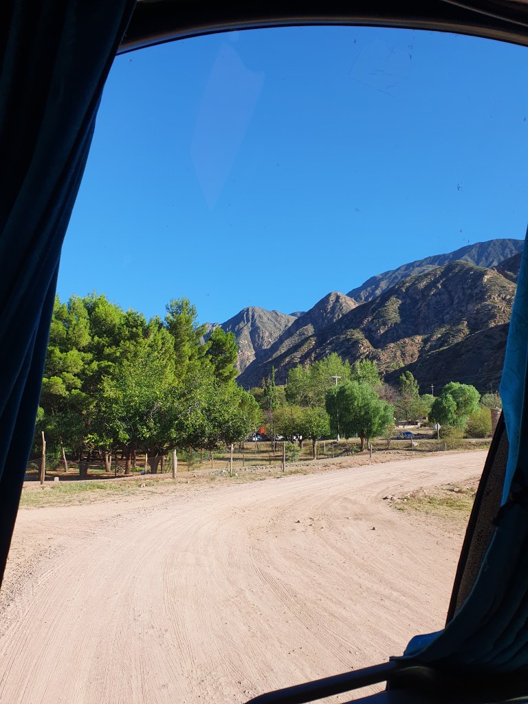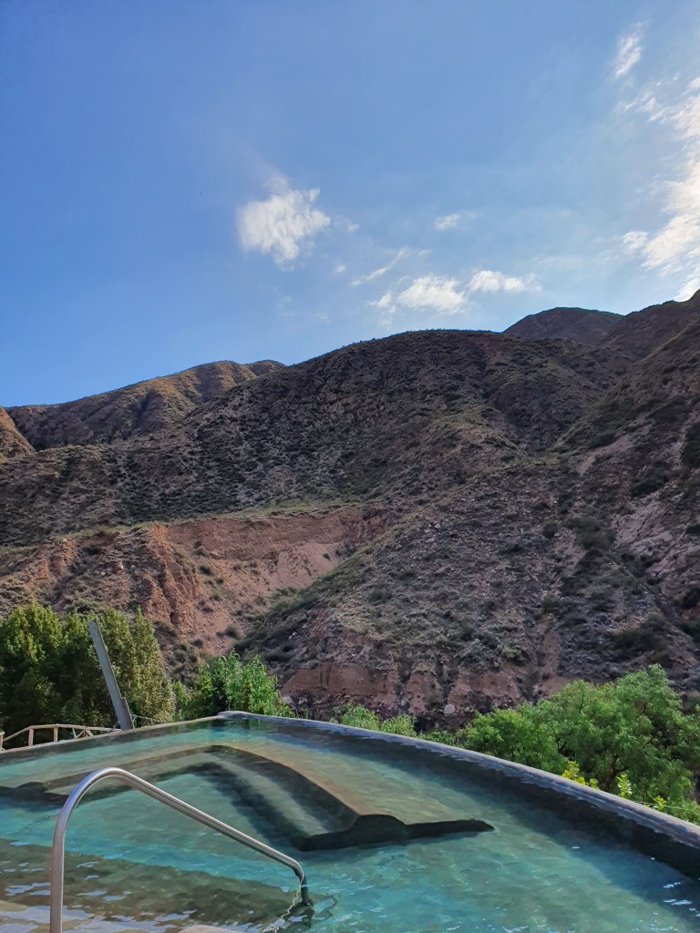 Viimeinen täysi päivä käytettiin yhdessä vuorten keskellä olevalla spalla, Termas de Cacheutalla. Matka kuljetuksineen varattiin etukäteen netistä. Bussille oli pieni kävelymatka (lähtee keskustasta, ei poimintaa majoitukselta) ja bussimatka kesti noin tunnin. Maisemat matkalla olivat upeat! Bussi meni ensin viiniviljelmien ohi ja tämän jälkeen se alkoi nousta vuoristoon.